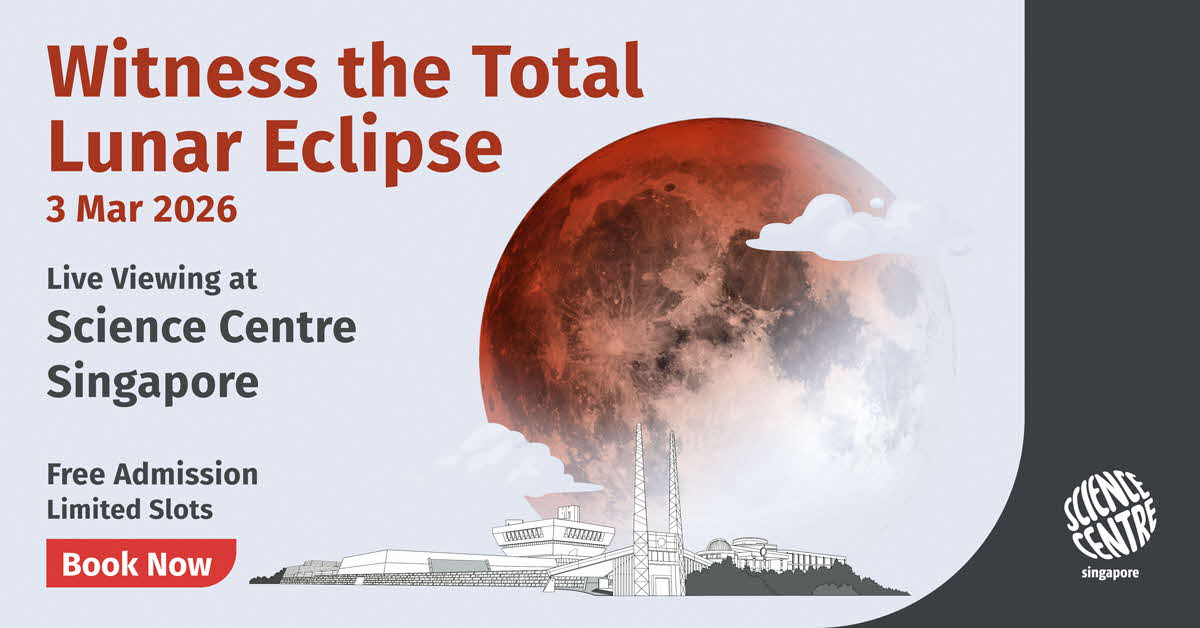 A total lunar eclipse is happening on 3 March 2026 and it is visible in Singapore! Join us to experience this rare astronomical phenomenon together, complete with Science Educators’ commentary and telescope viewing opportunities for an unforgettable evening under the stars.